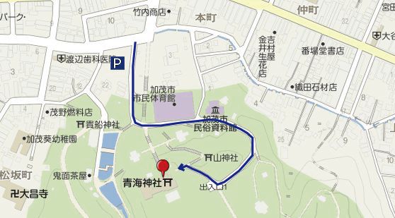 青海神社 一の鳥居(赤い鳥居)と加茂山公園駐車場の間の坂を上り、市民体育館の後ろ、加茂市民族資料館を通り、拝殿までお越しください。