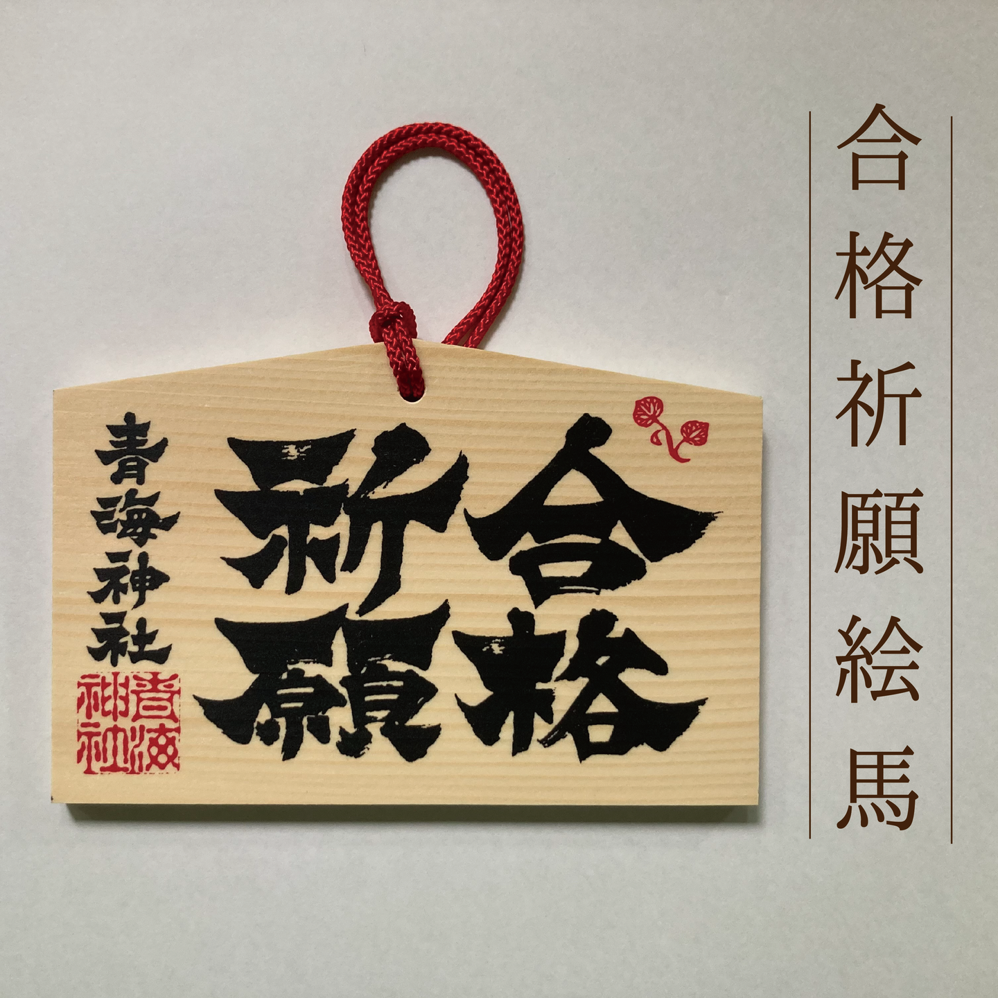『志を持って挑んでいる皆さまが、心身共に強く、心穏やかにその日を迎えられるように、心を込めて書きました。 末広がりで上昇を感じさせる縁起の良い字形ですので、手に取った人がパワーを感じてくれると思います。 そして、青海神社さまのご加護をいただき、二葉葵の印を添えていただきました。 ぜひ、この絵馬にご自身や大切な人の合格を祈願していただければと思います。』