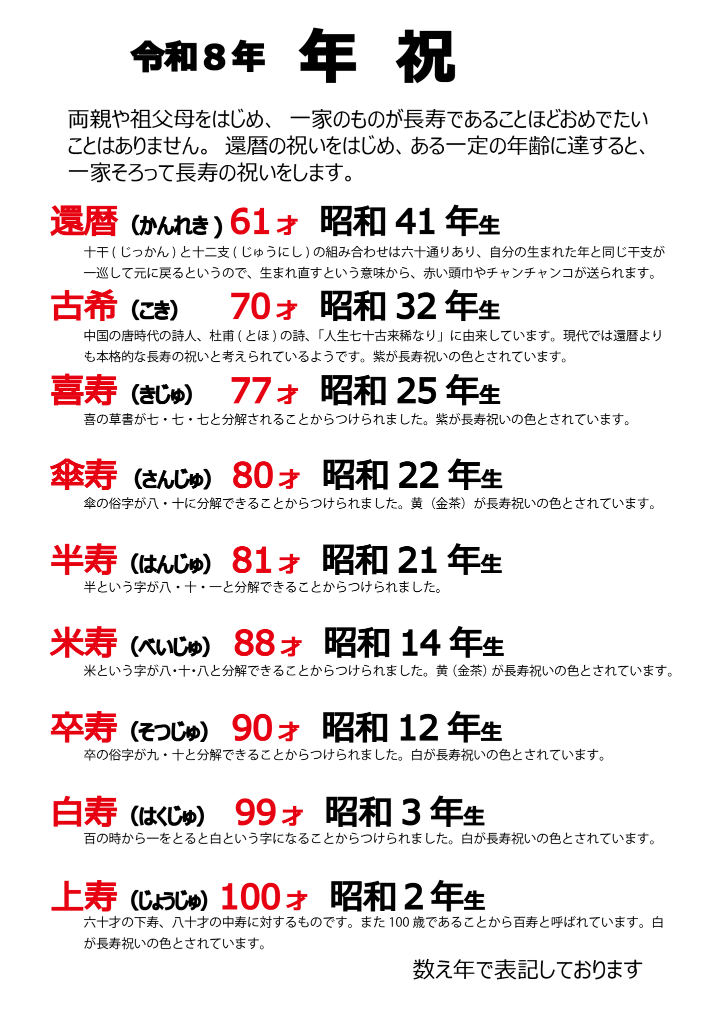 還暦(かんれき) 61才 昭和41年生まれ 古希(こき) 70才 昭和32年生まれ 喜寿(きじゅ) 77才 昭和25年生まれ 傘寿(さんじゅ) 80才 昭和22年生まれ 半寿(はんじゅ) 81才 昭和21年生まれ 米寿(べいじゅ) 88才 昭和14年生まれ 卒寿(そつじゅ) 90才 昭和12年生まれ 白寿(はくじゅ) 99才 昭和 3年生まれ 上寿(じょうじゅ)100才 昭和2年生まれ などの節目に、神社にお参りし、長寿のお祝いをいたします。 ※数え年で表記しております。(令和8年の表示をしております) . 年齢は、数え年の表記となります。 数え年とは、生まれた時を1歳とし、正月を迎えるたびに、年令を1才重ねるという計算方法です。 まだその年の誕生日を迎えていない場合: 満年齢 プラス2歳 すでにその年の誕生日を迎えた場合 : 満年齢 プラス1歳 . |