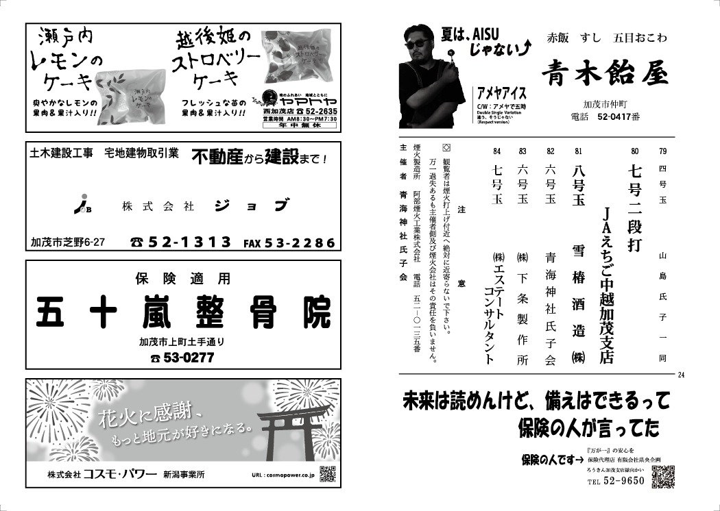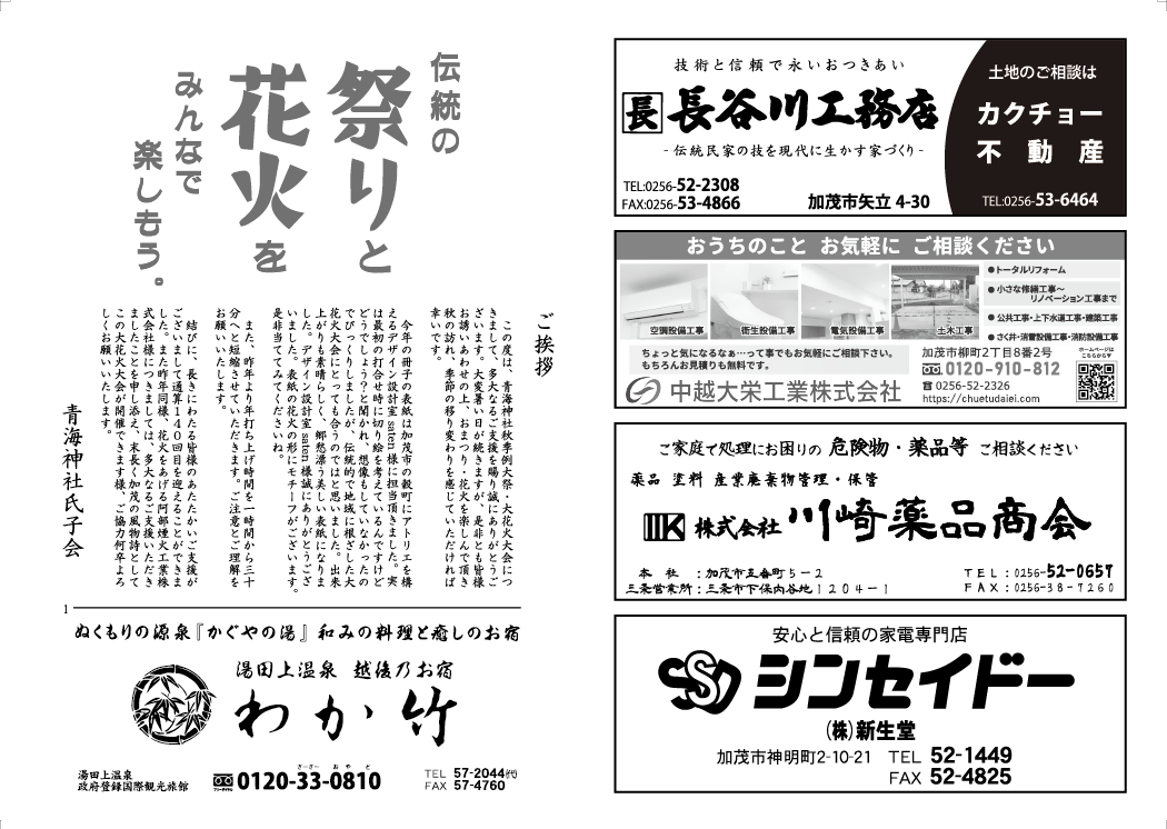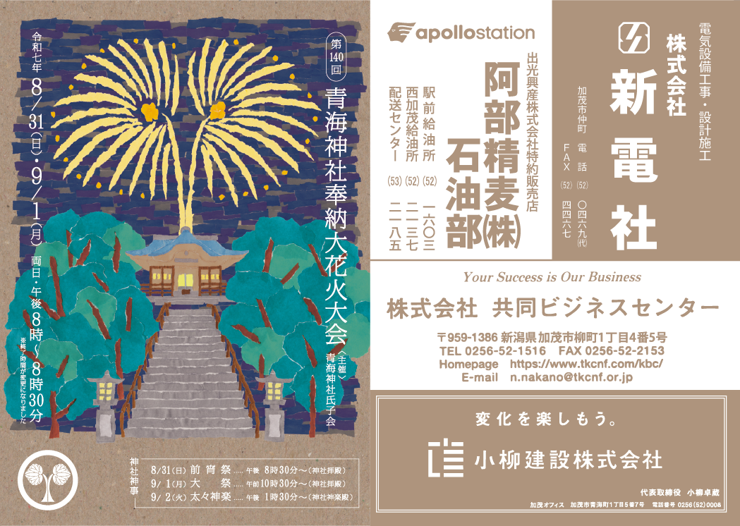 この度は、青海神社秋季例大祭・大花火大会につきまして、多大なるご支援を賜り誠にありがとうございます。大変暑い日が続きますが、是非とも皆様お誘いあわせの上、おまつり・花火を楽しんでいただき、秋の訪れ、季節の移り変わりを感じていただければ幸いです。